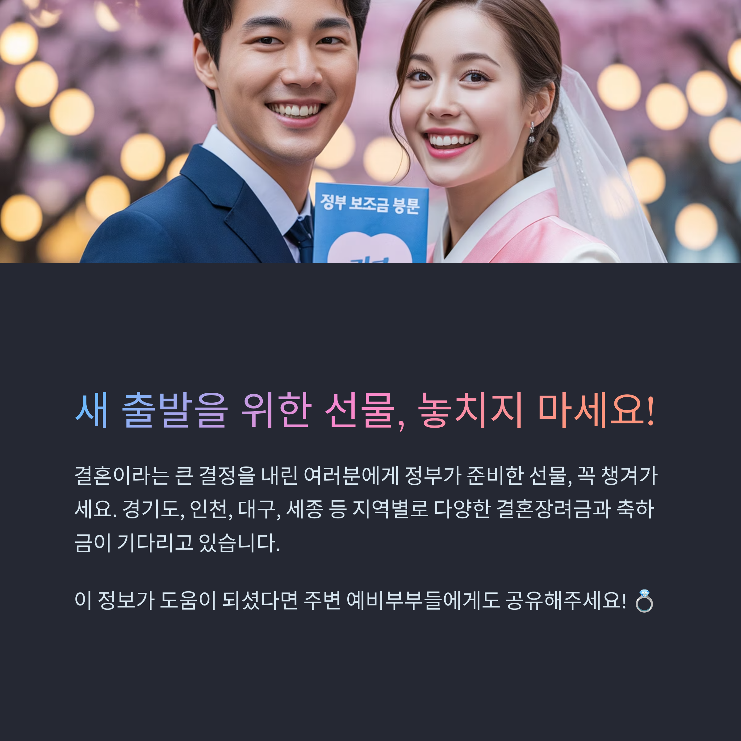 결혼, 정말 큰 결심이죠. 그런데 이 큰 결정을 내린 신혼부부에게 정부가 꽤 큰 선물을 준비해뒀다는 사실, 알고 계셨나요? 결혼장려금과 결혼축하금신청 제도를 잘만 활용하면 초기 생활비 부담이 훨씬 줄어듭니다. 경기도결혼장려금은 물론, 인천결혼장려금, 대구결혼장려금, 세종결혼장려금까지 각 지역별로 알차게 준비된 지원책이 많으니 지금 바로 확인해보세요. 오늘 이 글이 여러분의 새로운 시작에 작은 힘이 되길 바랍니다. 주변 예비부부들에게도 꼭 알려주세요!