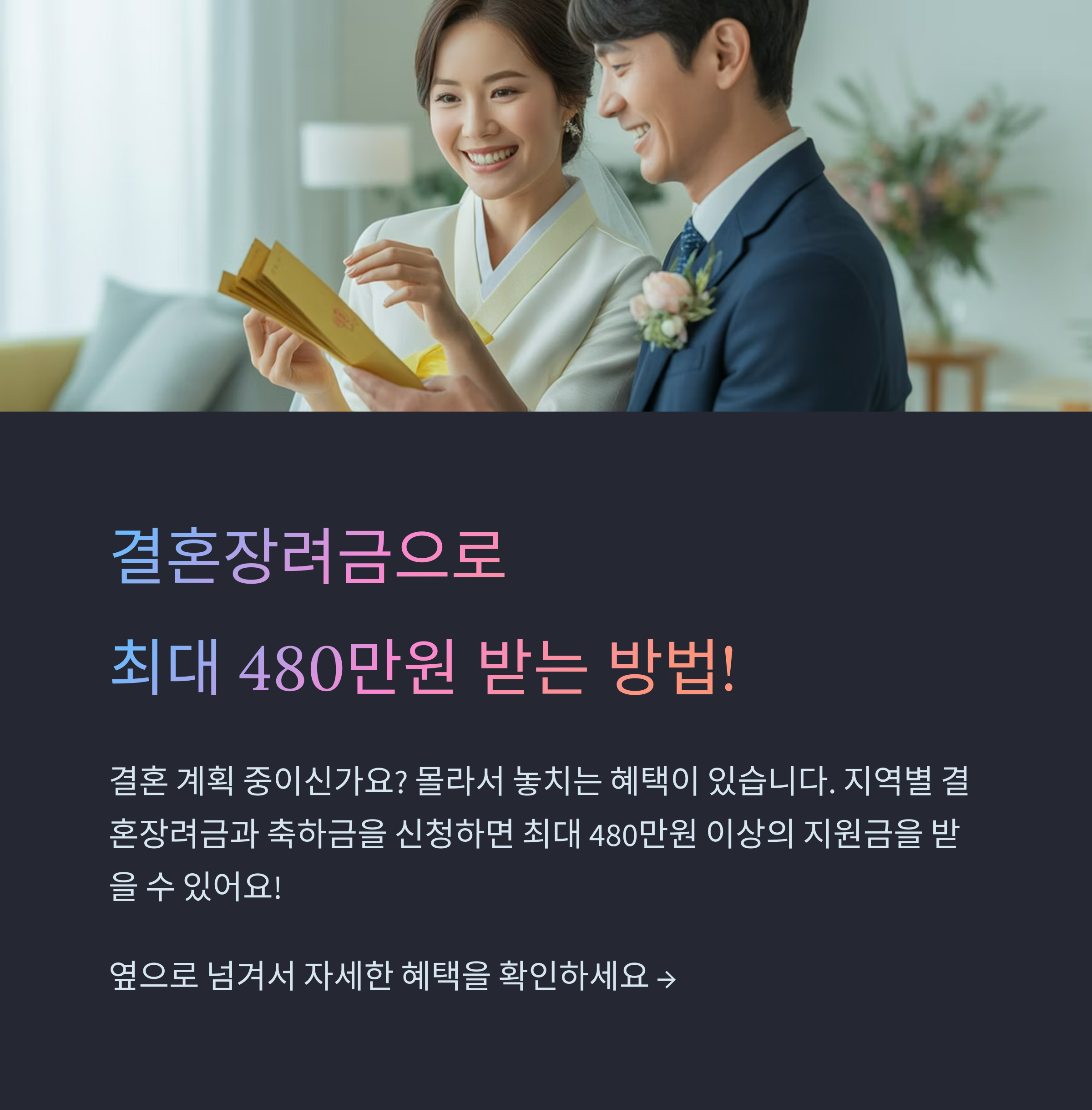지금 결혼 계획 중이라면? 결혼장려금과 결혼축하금신청만 잘해도 480만 원 이상 혜택 받을 수 있습니다!