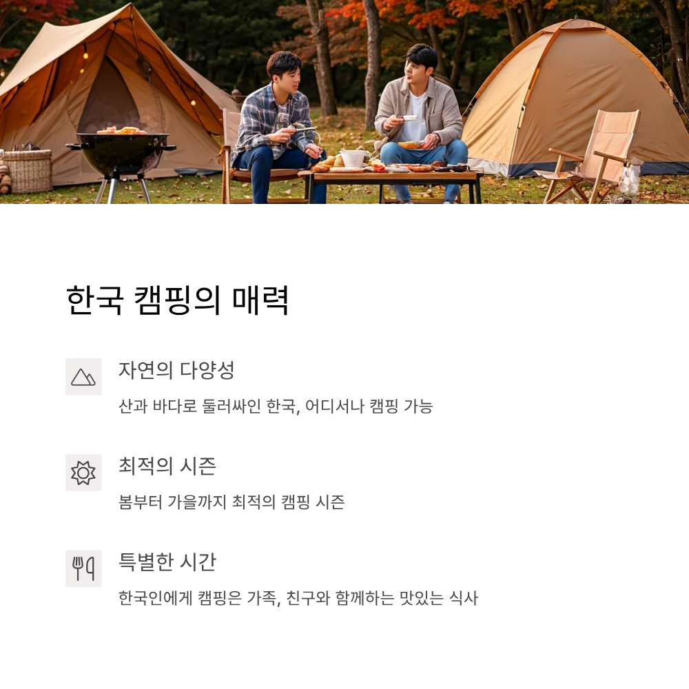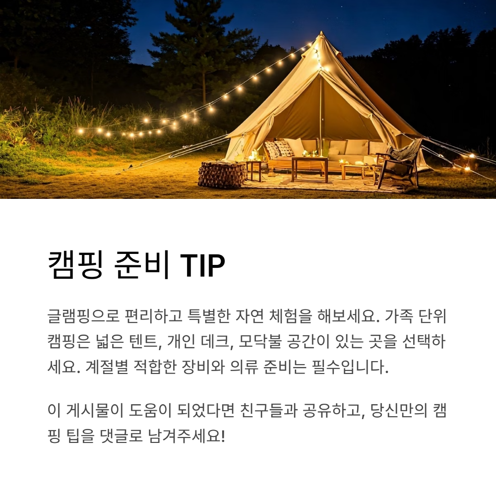 | 캠핑 유형 | 글램핑, 오토캠핑, 차박까지 다양하게 소개 |