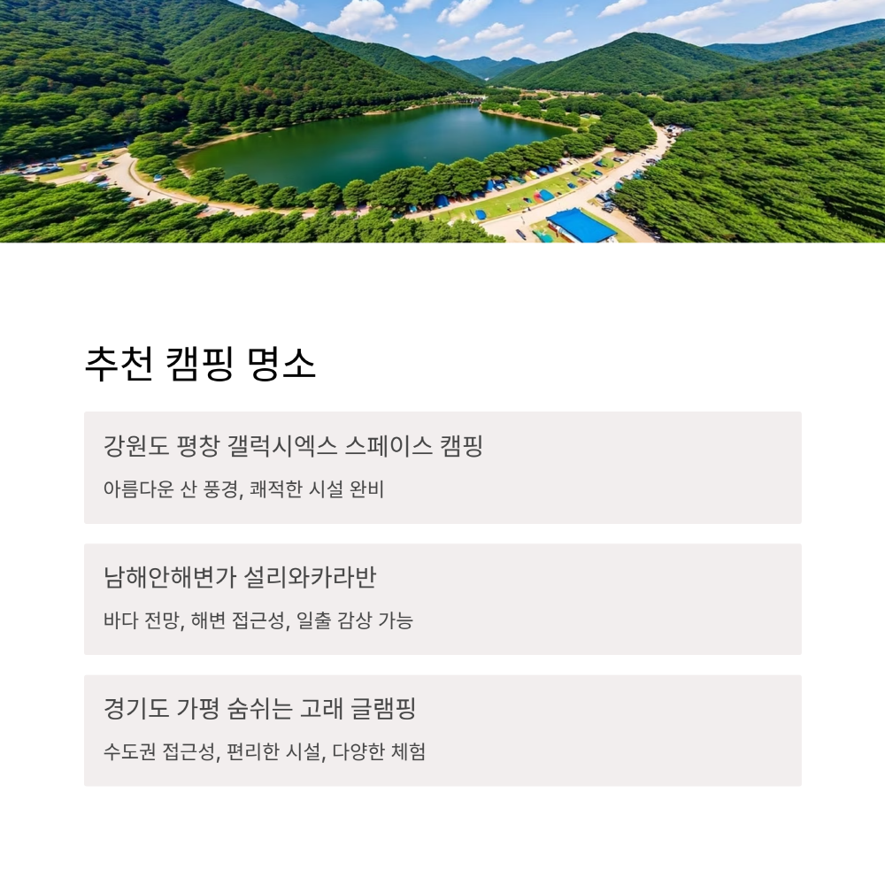 | 강원도 산악지대, 남해안 해변가 등 | 글램핑, 오토캠핑, 차박 등 다양 | 봄, 가을 가장 인기 |
