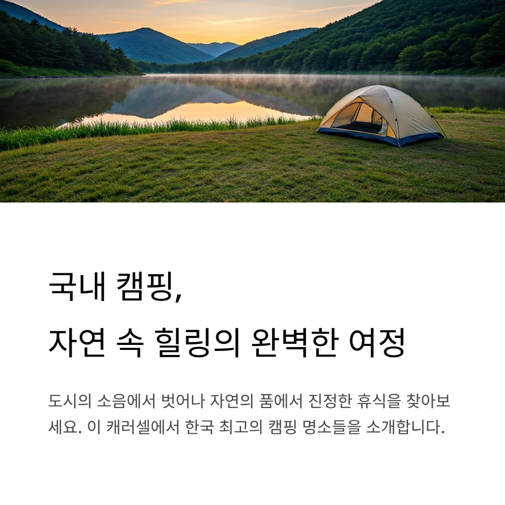 자연 속에서의 캠핑은 단순한 여행을 넘어 진정한 쉼과 회복을 안겨주는 귀중한 시간입니다. 계절마다 다른 매력을 지닌 국내 캠핑장들은 누구에게나 맞춤형 여행지로서의 가치를 지니고 있습니다. 이번 기회를 통해 몸과 마음이 모두 편안해지는 힐링의 시간을 직접 경험해보시길 바랍니다. 자연과 가까워질수록 삶의 여유와 깊이도 한층 풍성해질 것입니다.