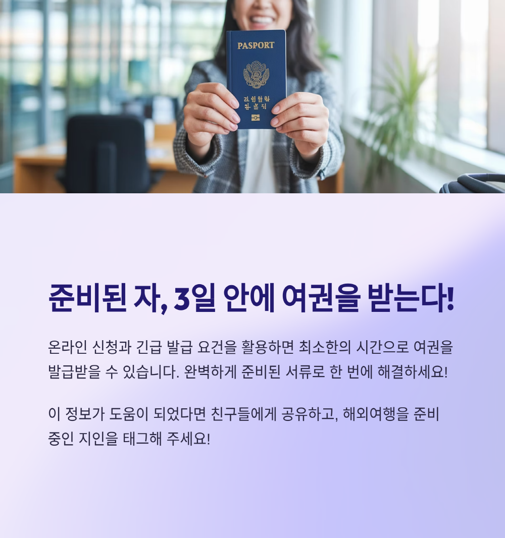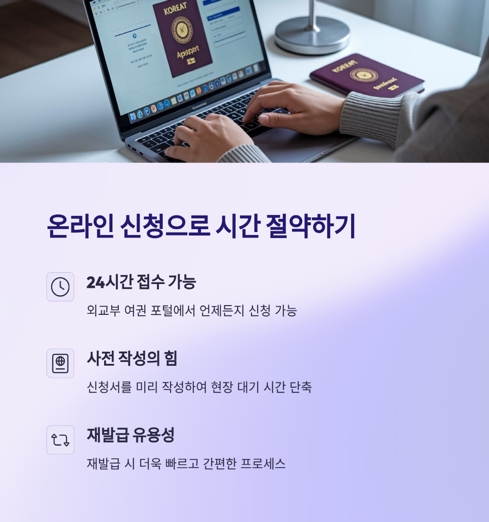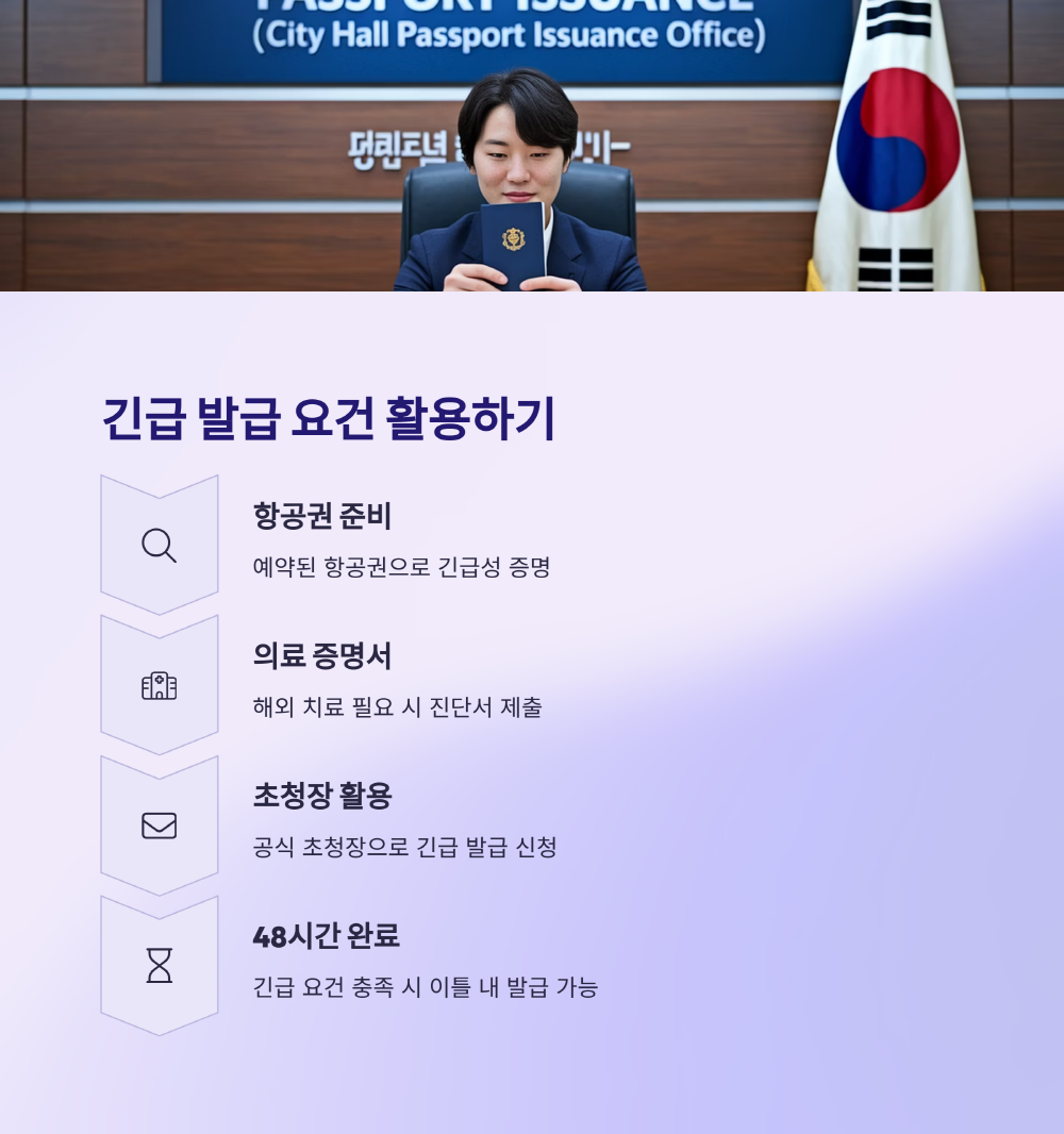 | 외교부 여권 포털 이용 시 간편 신청 가능 | 항공권 증빙 시 1~2일 내 처리 가능 | 시간 절약, 방문 없이 수령 가능 |