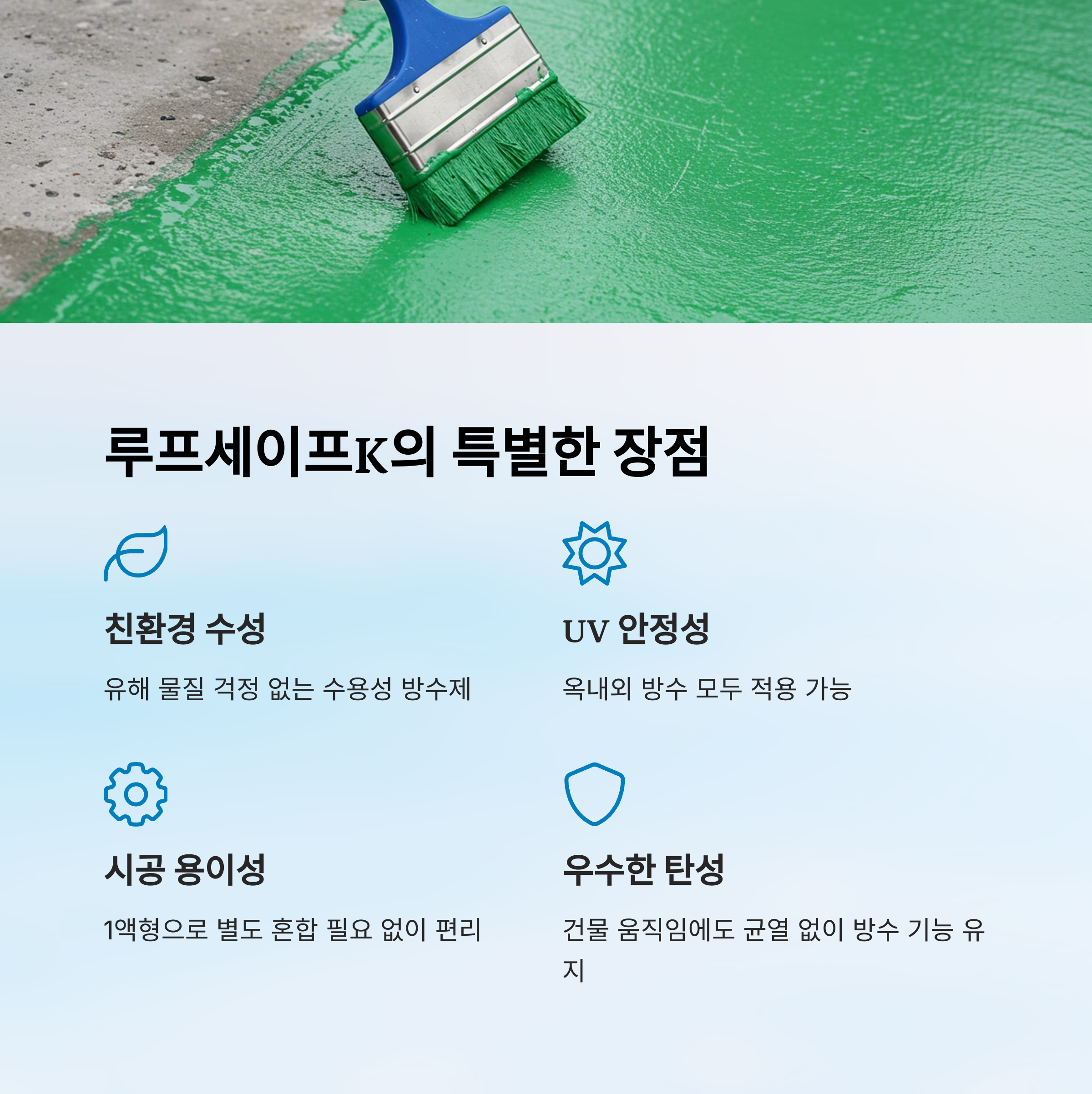 "옥상방수는 이제 단순히 '물이 새지 않게 하는 것'을 넘어, 건물의 에너지 효율과 생활 공간의 확장이라는 측면에서 접근하는 추세입니다. 특히 루프세이프K와 같은 고품질 방수제는 단순 방수를 넘어 옥상의 가치를 높이는 투자로 볼 수 있습니다."
