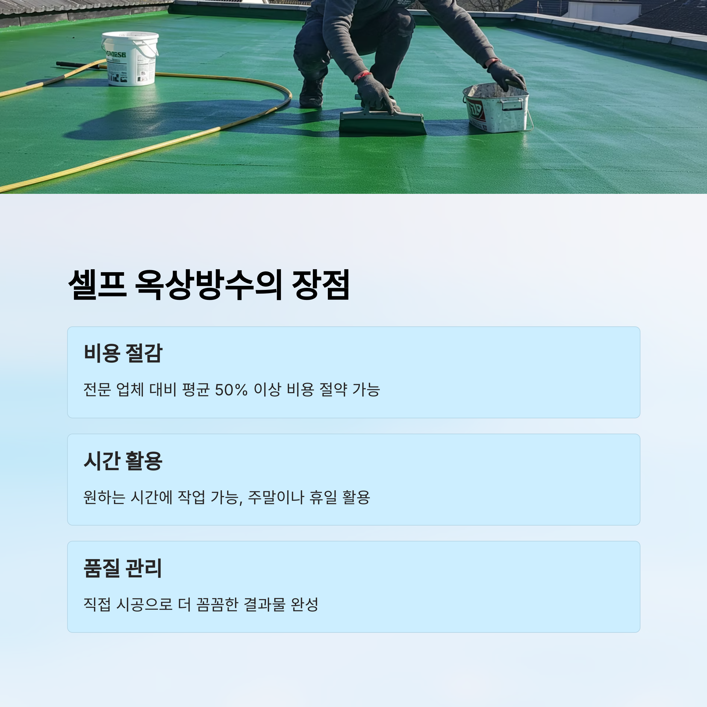 ✅ 비용 절감: 전문 업체에 맡기면 인건비가 포함되어 적게는 몇십만 원, 많게는 수백만 원까지 들 수 있어요. 셀프 옥상방수는 재료비만 들기 때문에 평균적으로 50% 이상 비용을 절감할 수 있습니다. ✅ 시간 절약: 업체 스케줄에 맞추지 않고 내가 원하는 시간에 작업할 수 있어요. 주말이나 휴일을 활용해 여유롭게 진행할 수 있죠. ✅ 품질 관리: 직접 시공하면 꼼꼼히 확인하며 작업할 수 있어 오히려 더 꼼꼼한 결과를 얻을 수도 있어요. 특히 업체에서 대충 넘어갈 수 있는 세부적인 부분까지 신경 쓸 수 있죠. ✅ 성취감: "와, 내가 직접 했다!" 하는 뿌듯함은 셀프 옥상방수의 큰 보너스입니다. DIY의 재미를 느낄 수 있어요.