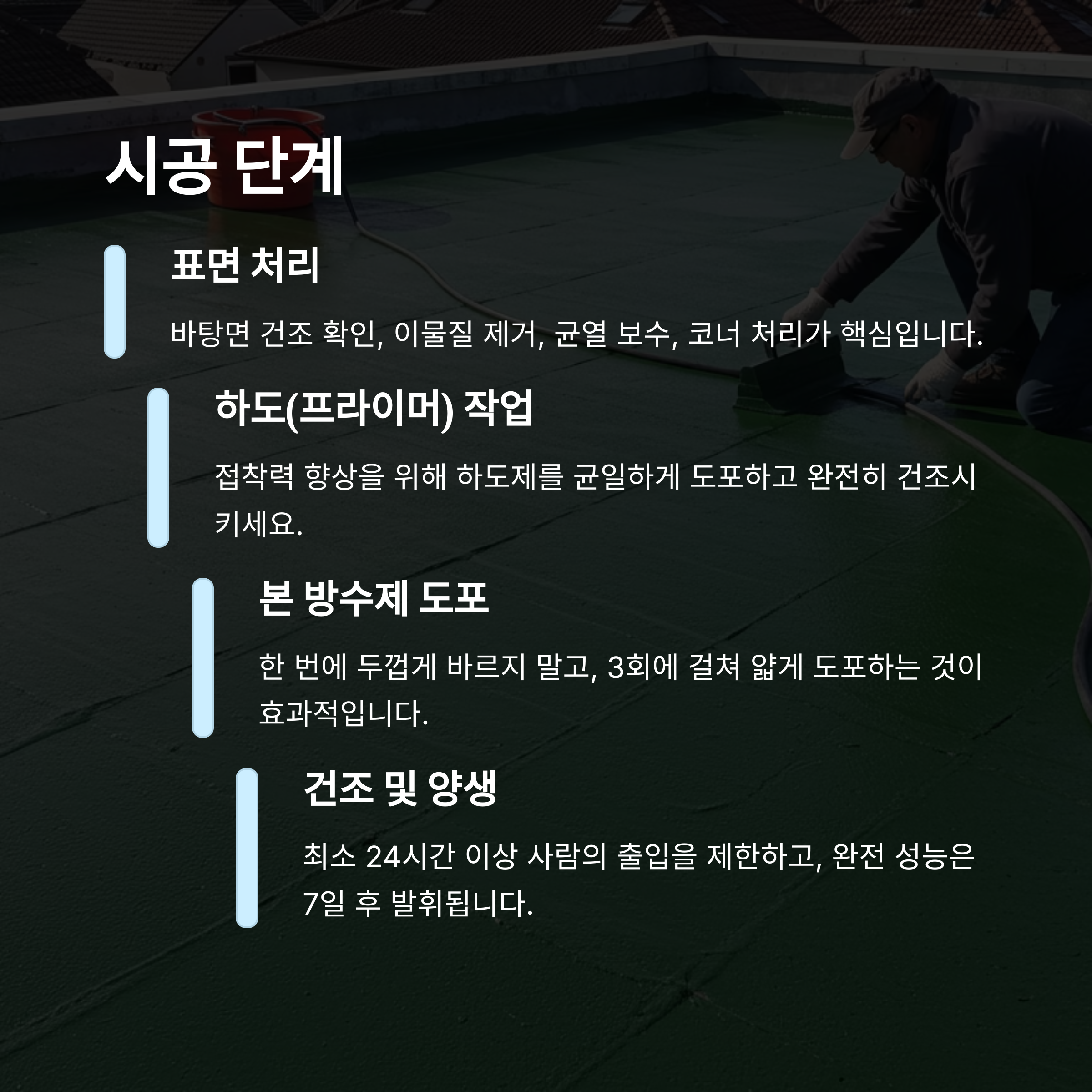 - 꼼꼼한 시공특히 취약 부위(코너, 파이프 주변)는 더욱 신경 써서 처리하고, 3회 이상 나눠서 도포하는 것이 중요합니다.
