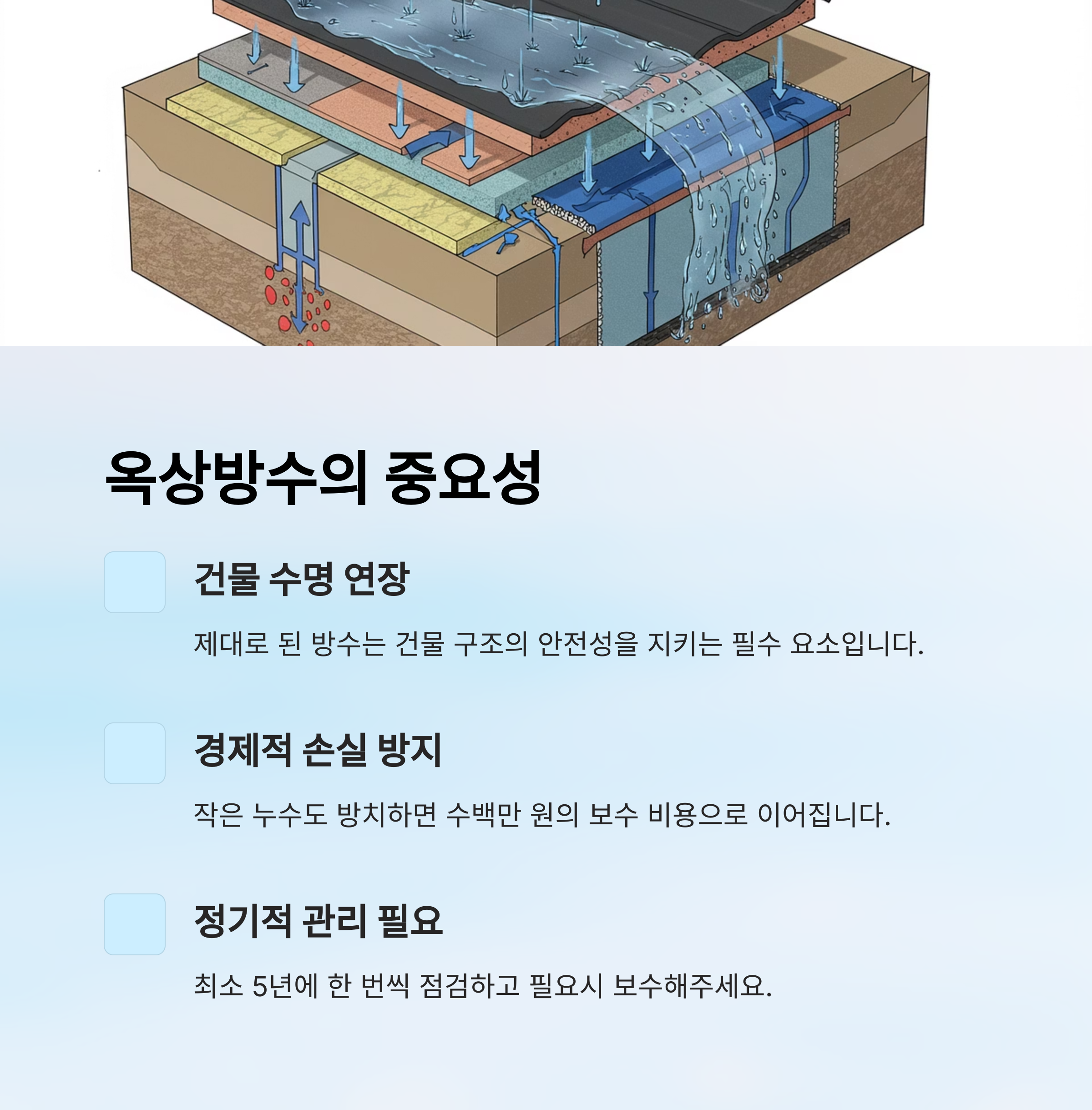 💡 TIP: 옥상방수는 최소 5년에 한 번씩은 점검하고, 필요시 보수해주는 것이 좋습니다. 특히 건물이 10년 이상 된 경우라면 더욱 신경 써야 해요!
