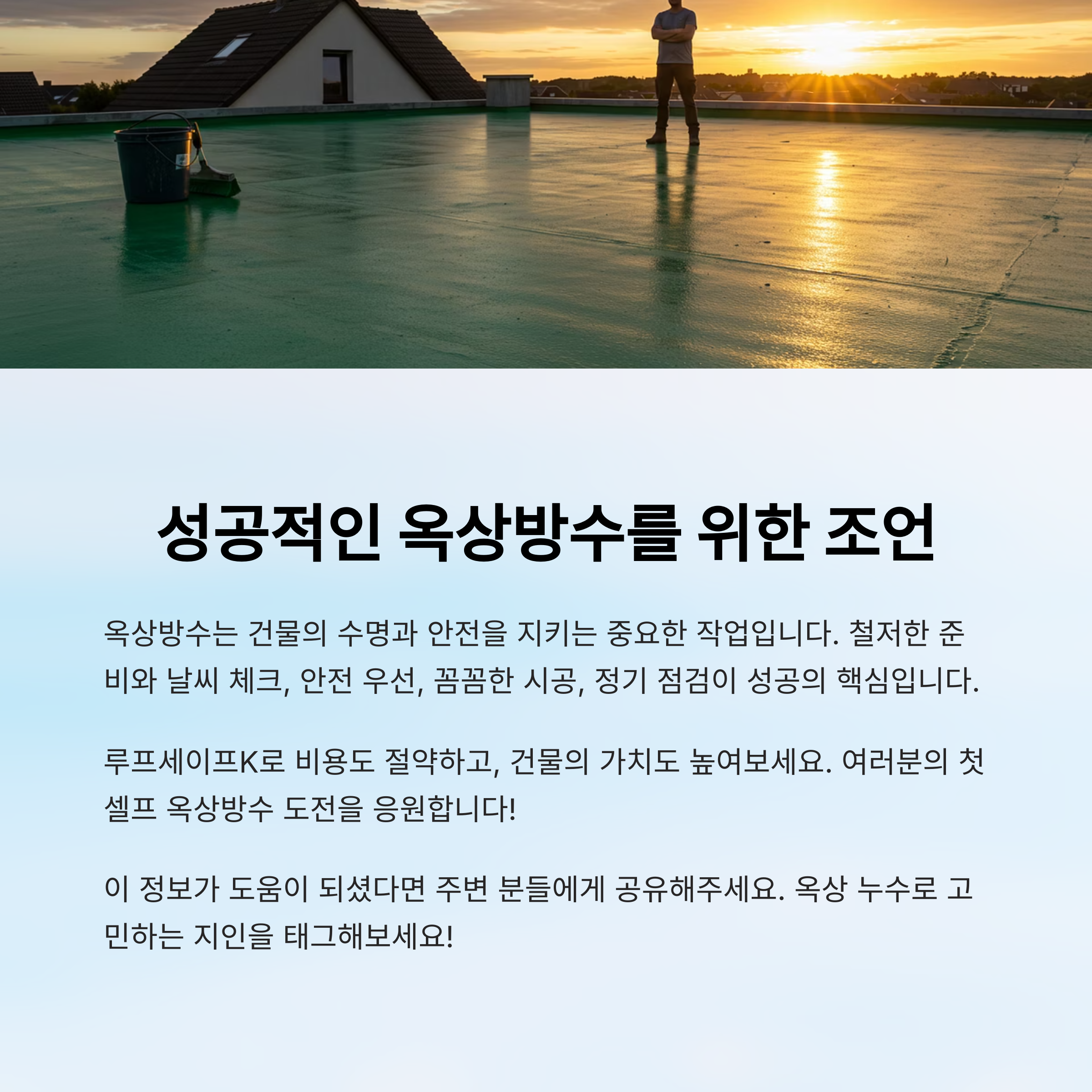 옥상방수는 건물의 수명과 안전을 지키는 중요한 작업입니다. 지금까지 살펴본 것처럼, 루프세이프K를 활용한 셀프 옥상방수는 비용 절감과 만족도 측면에서 훌륭한 선택이 될 수 있습니다. 성공적인 옥상방수를 위한 마지막 조언을 드립니다: