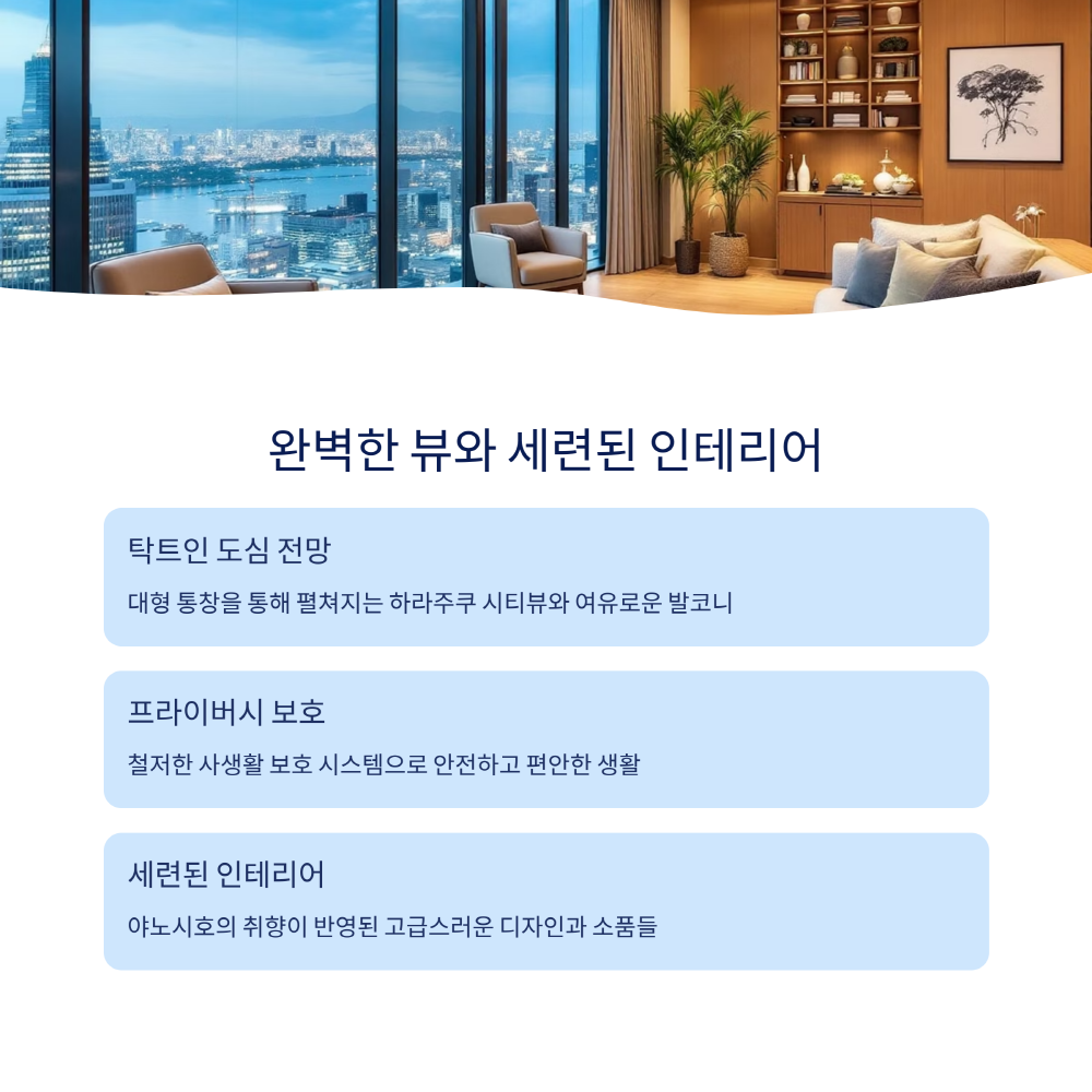 추성훈·야노시호 50억 도쿄 하라주쿠 집의 가장 큰 특징은 대형 통창과 발코니예요. 도쿄 도심의 스카이라인을 한눈에 내려다볼 수 있도록 설계되어 있죠. 일반적인 집에서는 상상하기 힘든 그 개방감! 게다가 인테리어도 일본식 미니멀과 세련된 모던함이 믹스된 스타일이라 눈이 즐거워요.