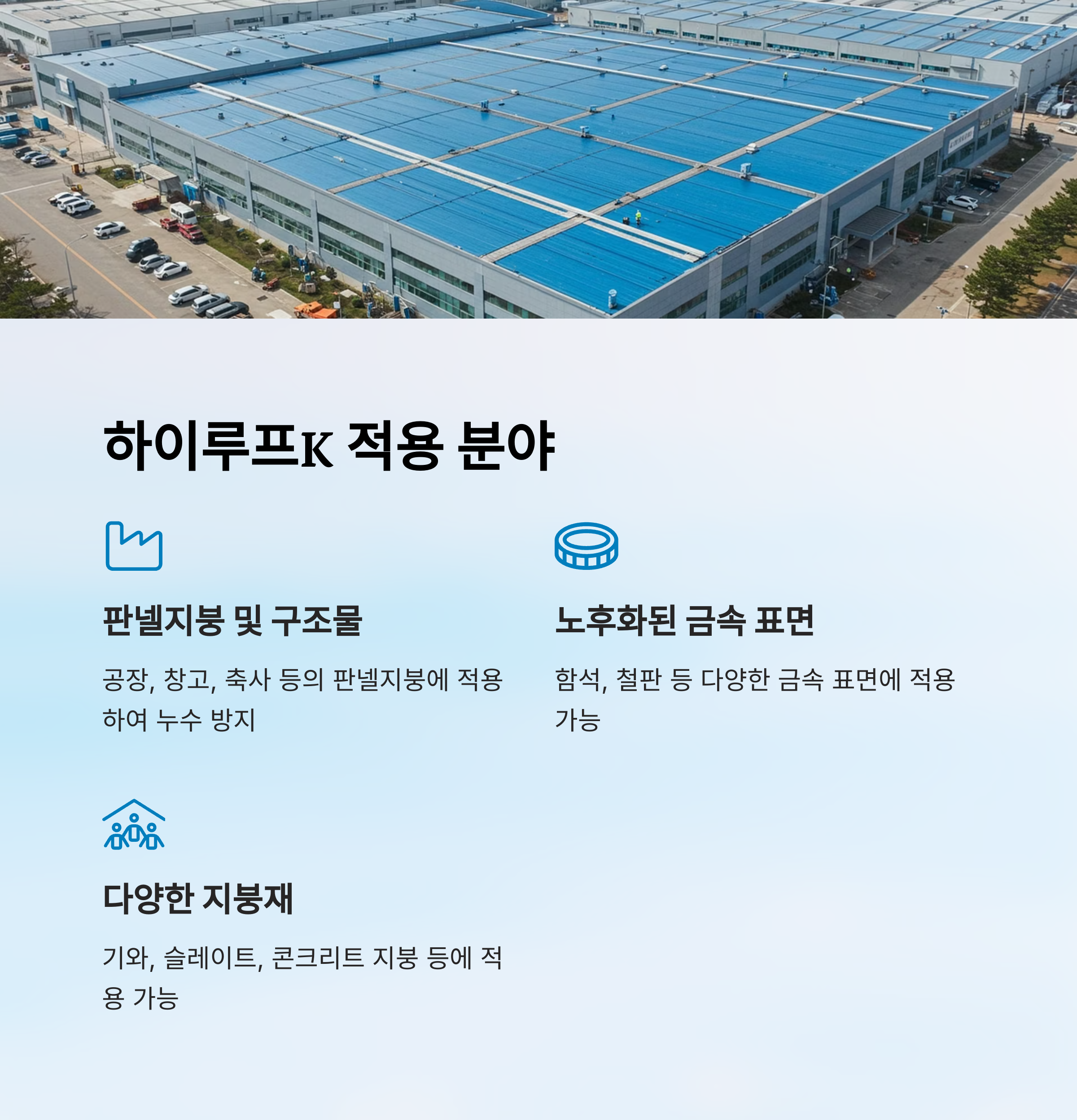 판넬지붕방수의 가장 기본적인 적용 분야입니다. 공장, 창고, 축사 등의 판넬지붕에 적용하여 누수를 방지하고 내구성을 강화합니다. 특히 노후화된 판넬지붕의 경우, 하이루프K를 적용하면 판넬 교체 없이도 방수 효과를 회복할 수 있어 비용 절감 효과가 큽니다.