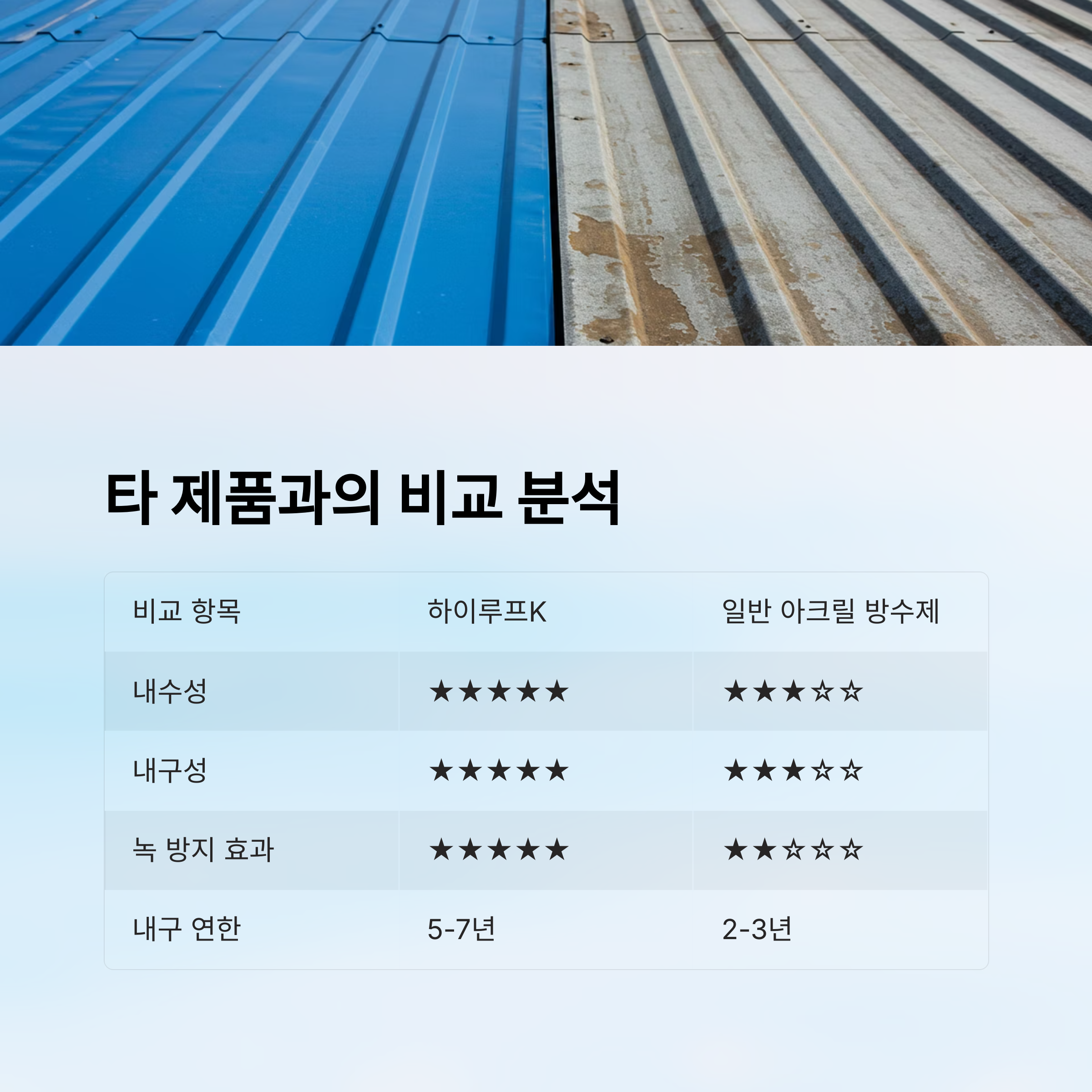 | 비교 항목 | 하이루프K | 일반 아크릴 방수제 | 우레탄 방수제(기존) |