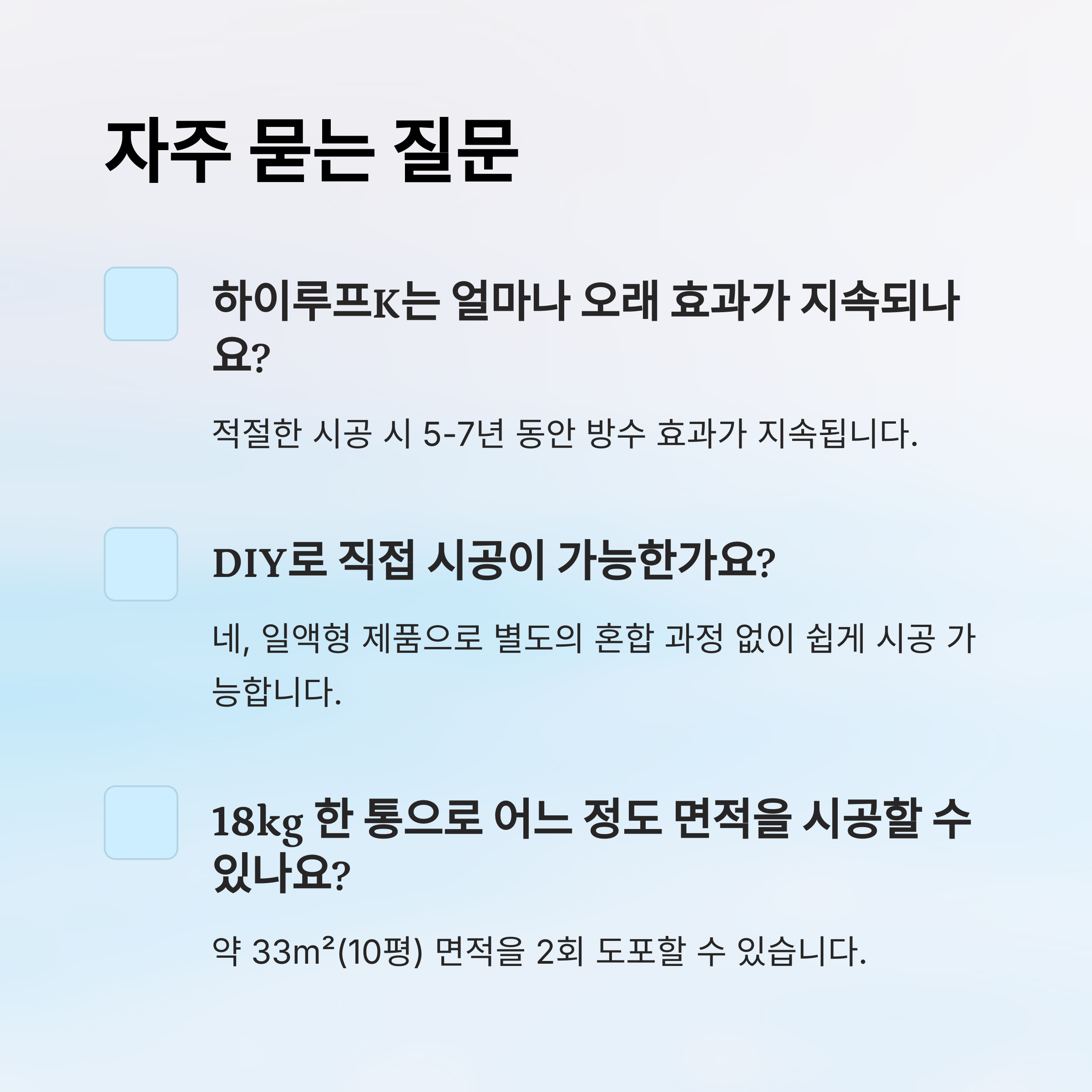| 시공 면적 | 1말(18kg)에 10평(2회 시공 기준) |