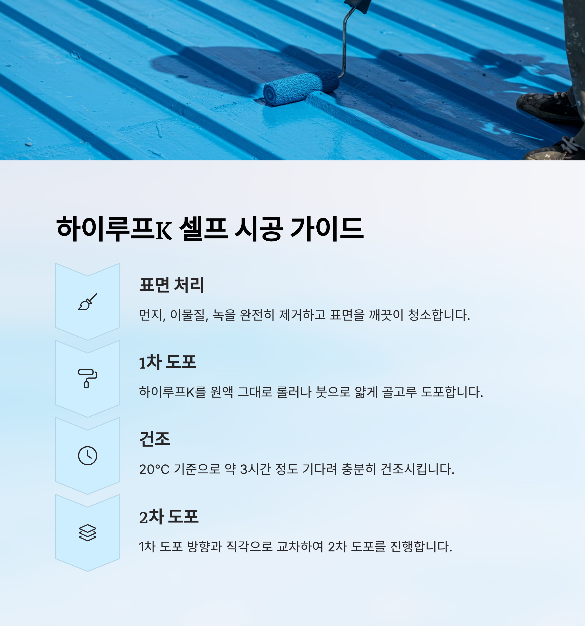 하이루프K는 전문 업체의 시공도 좋지만, DIY 방식으로 직접 시공하기에도 적합한 판넬방수제입니다. 일액형 제품으로 별도의 혼합 과정 없이 바로 사용할 수 있어 초보자도 쉽게 도전할 수 있습니다. 아래에서 단계별 시공 방법을 상세히 알아보겠습니다.