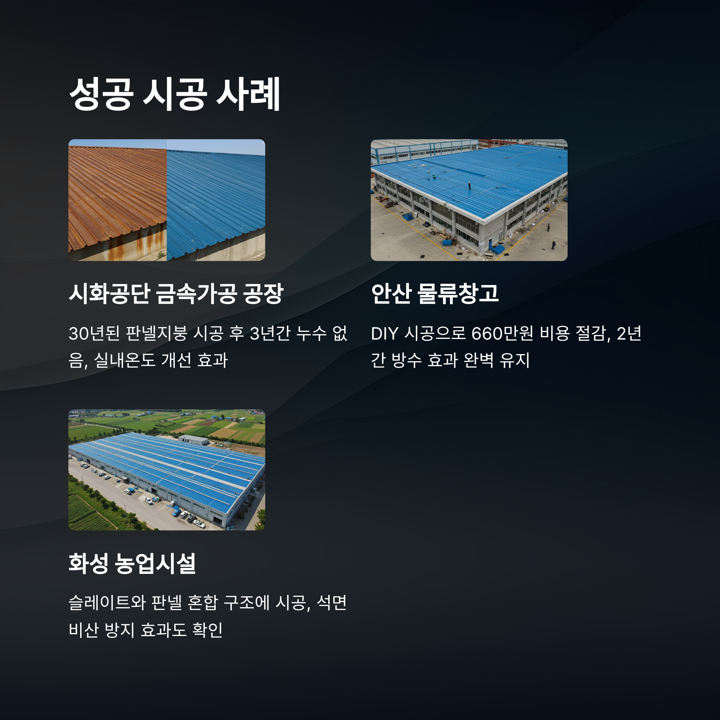 결과: 시공 후 비가 내려도 누수가 완전히 해결되었으며, 특히 겨울철 실내 보온 효과가 향상되어 난방비 절감 효과도 있었습니다. 농장주는 "작물 재배환경이 안정되어 생산성이 15% 가량 증가했다"고 보고했습니다.